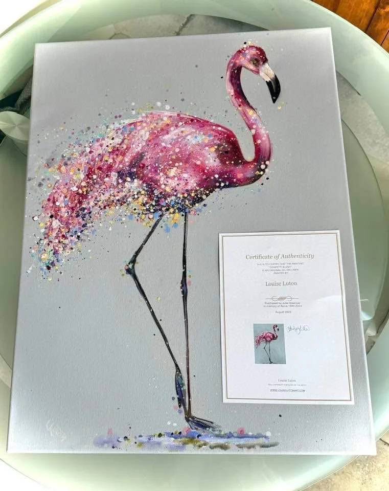 That moment came recently, after the sad passing of her mum. Her mum loved colour, and Julie wanted to mark her memory in a joyful way. Julie also loves her travels, so when she saw Confetti Blush — a vibrant flamingo painting full of life and energy — it suddenly felt like the perfect choice.