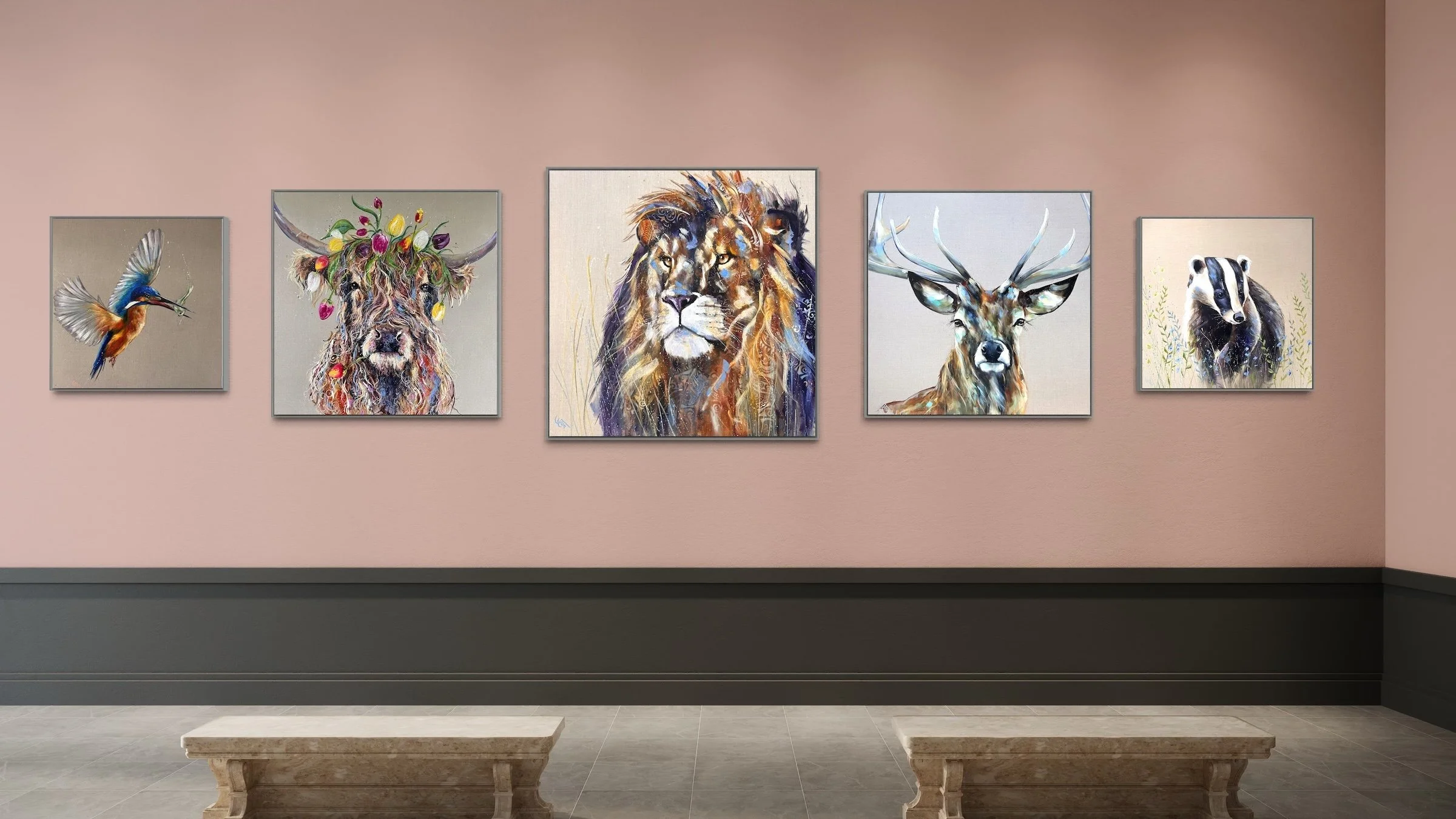 Here's an example based on a print. On the left is one of my best sellers, Majesty. The client wanted a 100cm square painting, without gold leaf on the antlers. They also selected their own palette to include some smokey greens to tone in with their decor. The final painting is beautiful.