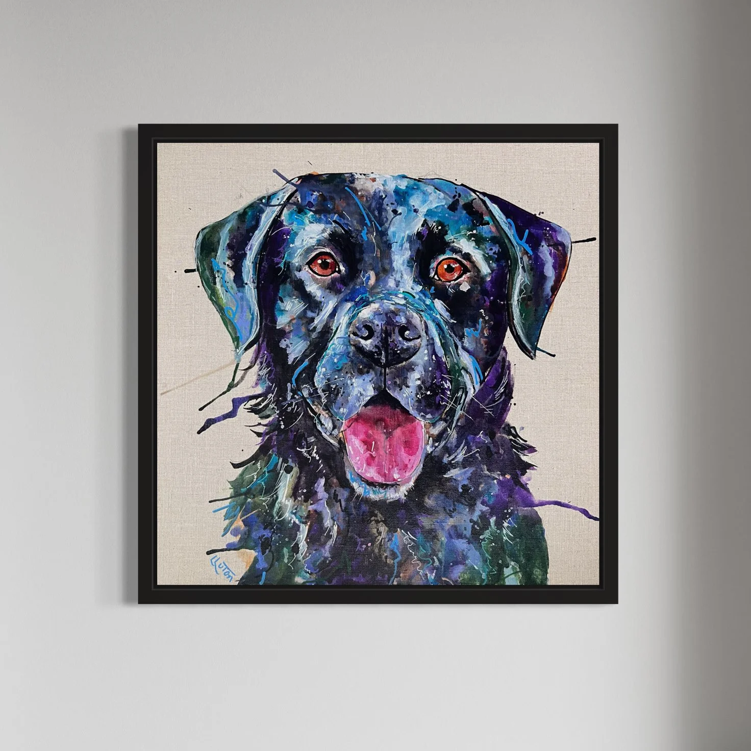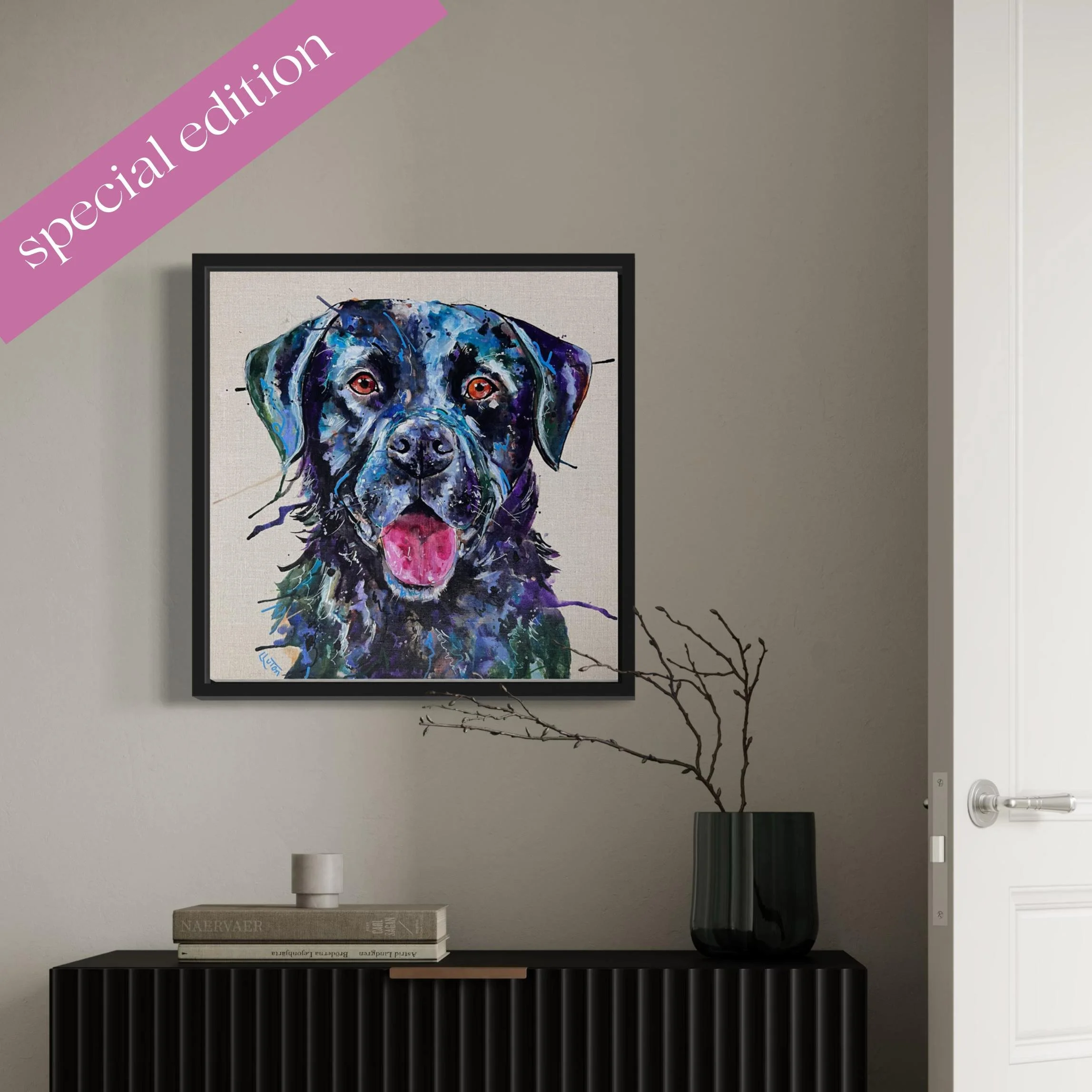 This loveable lab epitomises the way black labs seem to smile when they open their mouths. Such a loving dog, you’ll smile everyday when you walk pas this treasure. This is a special edition for my website. This is a high quality print in a slim black frame. Printed on canvas board.