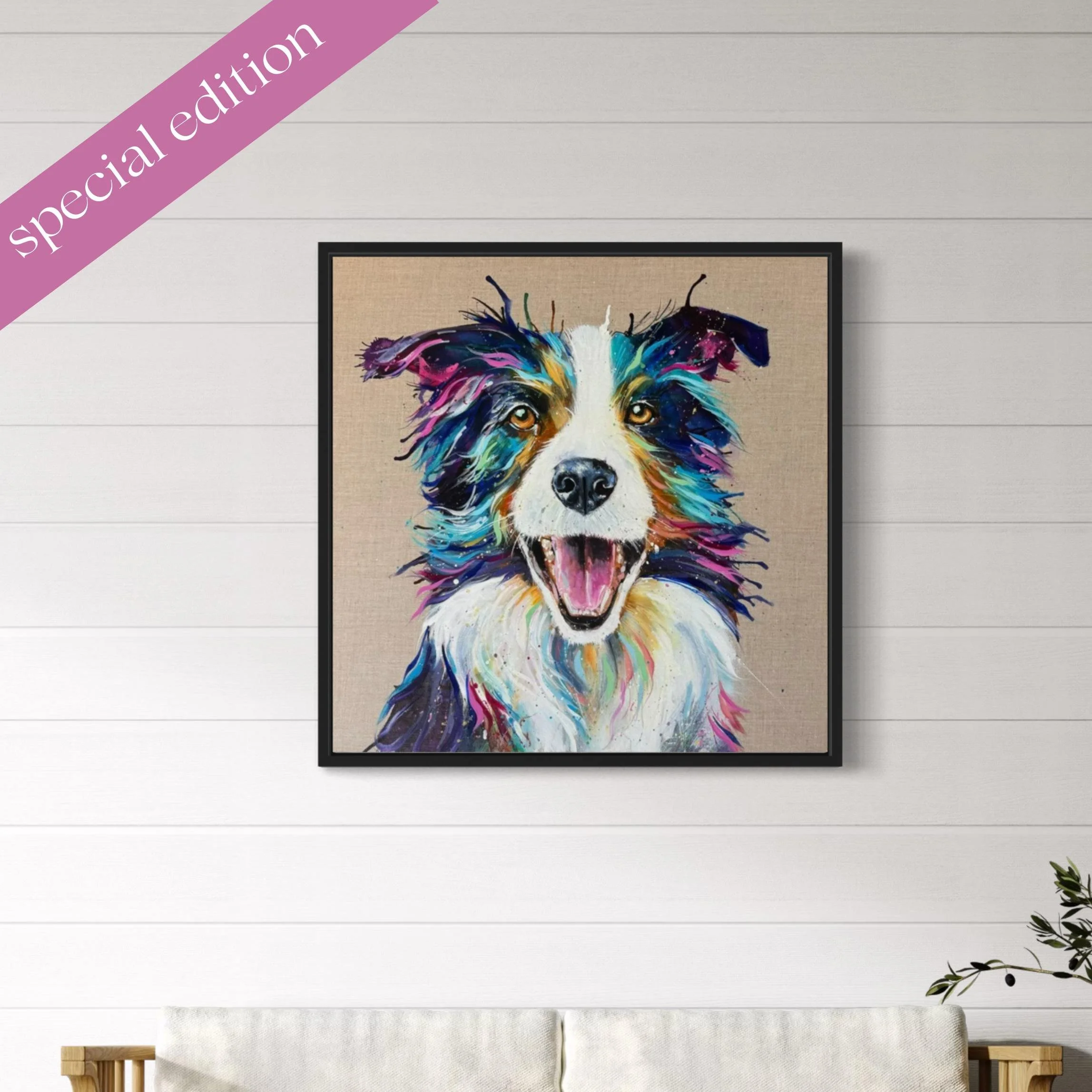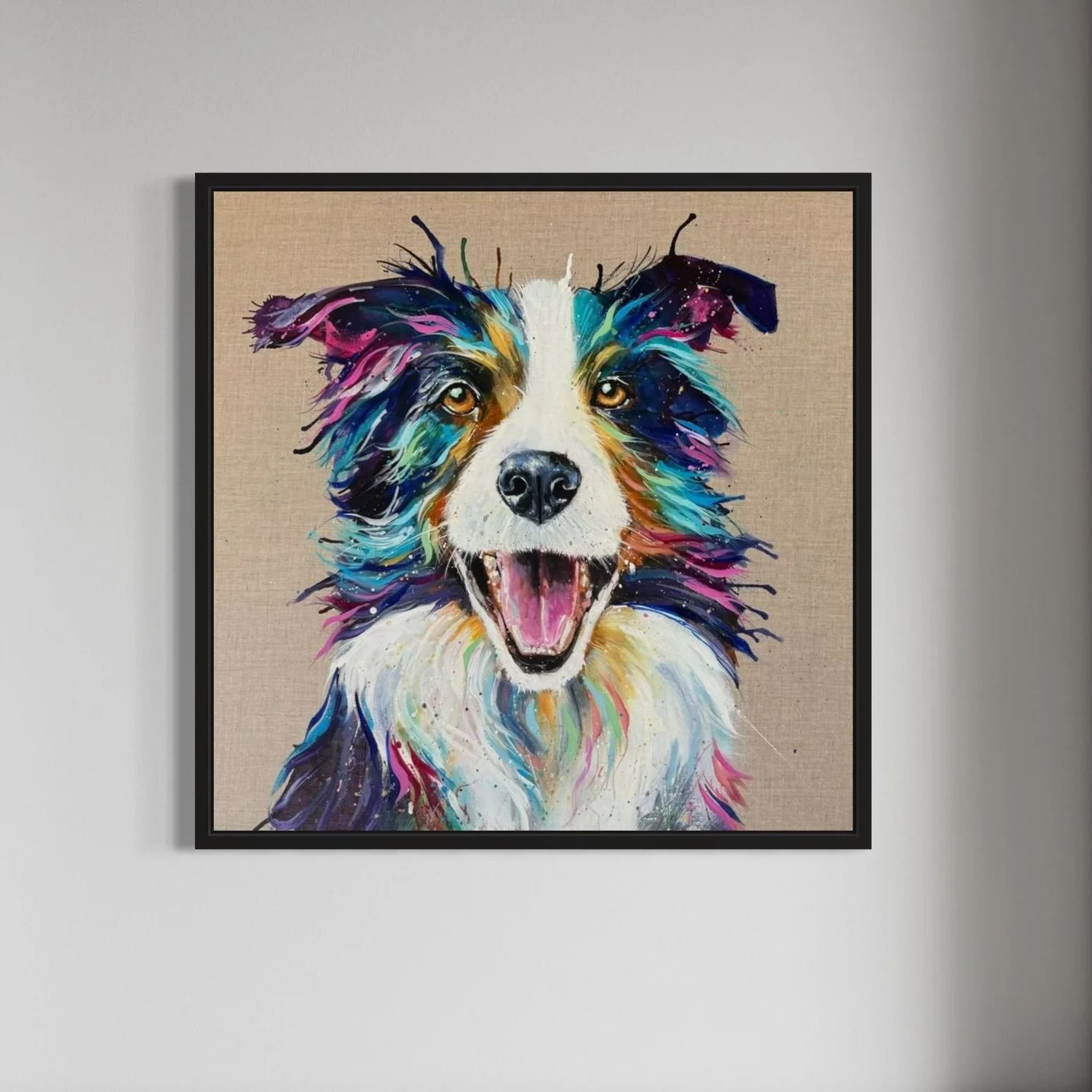 Max is a Border Collie. This is a high quality print in a slim black frame. Printed on canvas board.