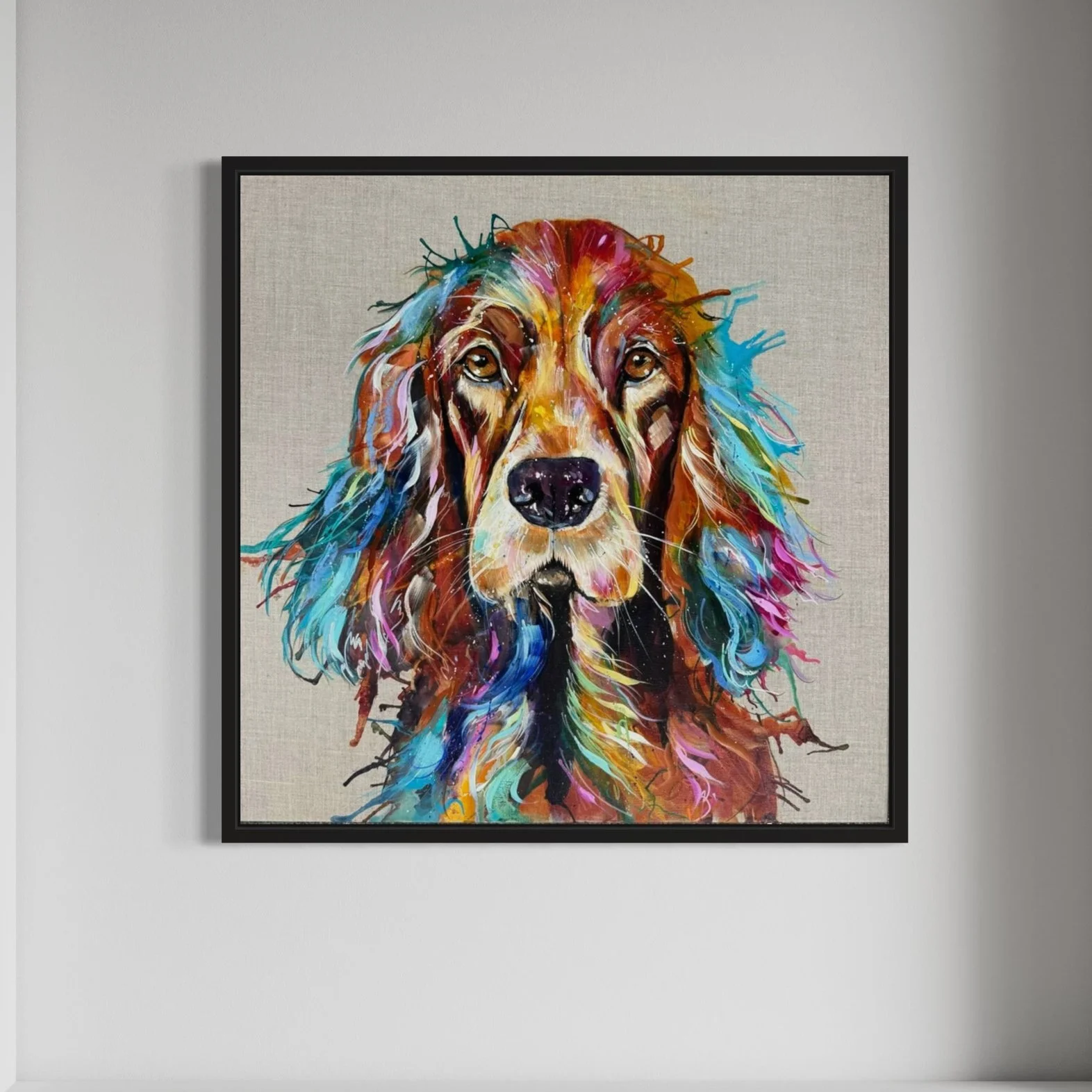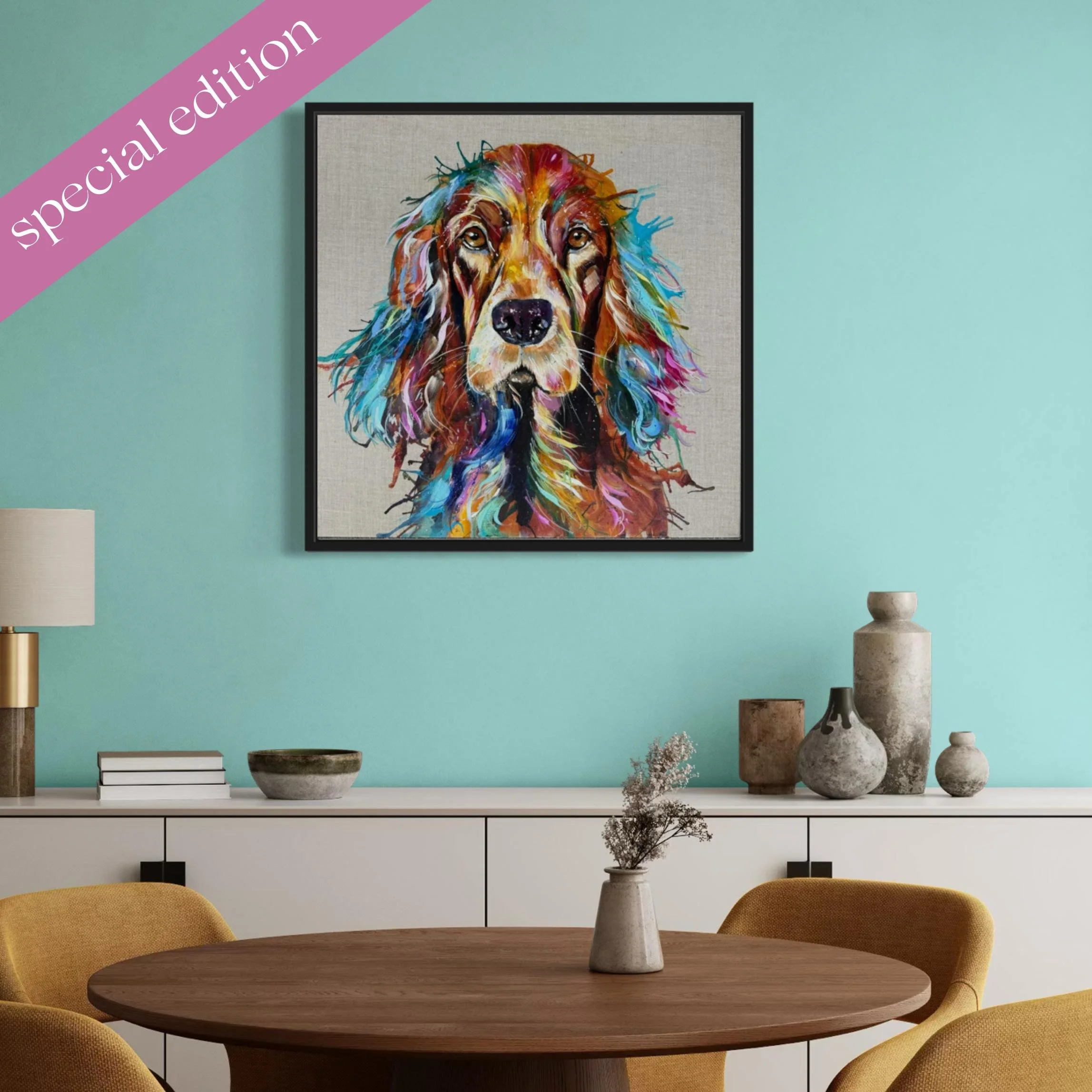This gorgeous cocker spaniel, with ears that go on for years and the most wonderful colours will make you smile every time you look at him. This is a high quality print in a slim black frame. Printed on canvas board.