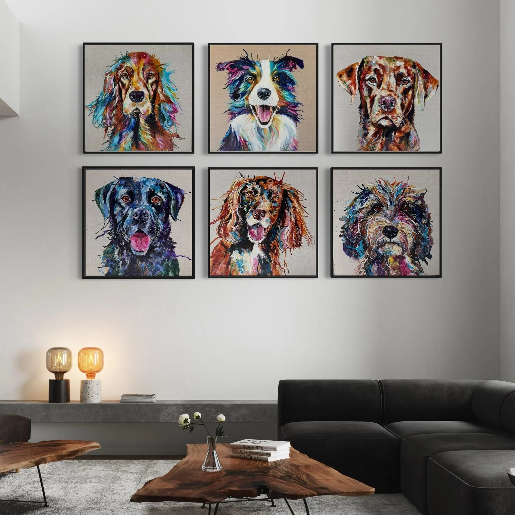 Part of my framed whimsical woofers collection. Joyful colourful dog prints.